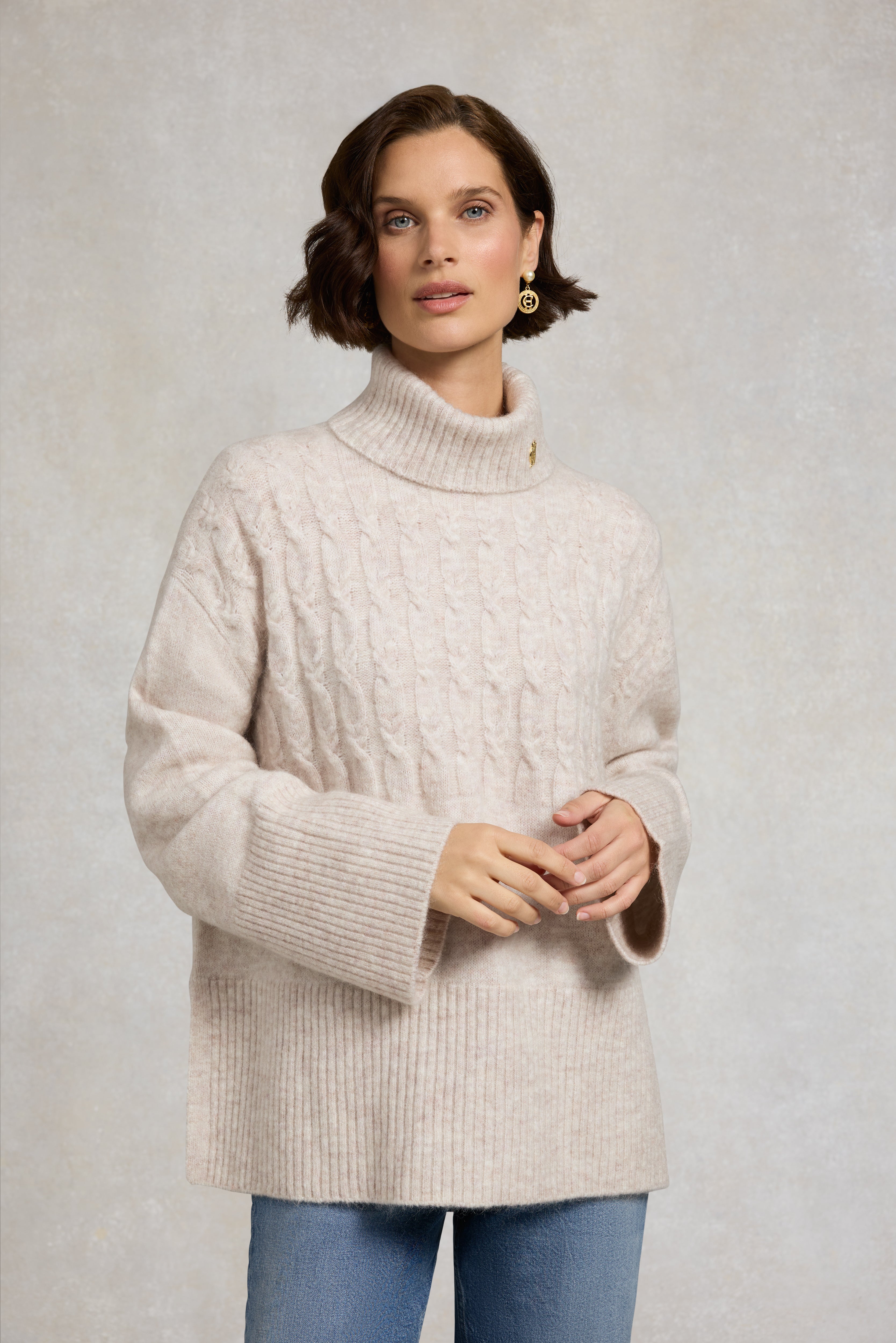Wrap yourself in relaxed luxury with the Holland Cooper Antonia Cable Roll Neck. Crafted from a soft mohair blend, this beautifully textured knit offers an oversized fit with drop shoulder sleeves for effortless comfort and style. Subtle cabling across the upper body adds depth, while ribbed trims and the signature HC plaque at the roll neck lend a refined finish. Easy to care for and endlessly versatile, it layers perfectly over jeans for country walks or pairs with tailored trousers for a polished weekend look.
