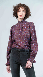 There’s something undeniably charming about a crisp autumn stroll beneath turning leaves — and the Auora blouse captures that feeling in every thread. Cut from soft brushed cotton with a rich wine base and delicate floral pattern, this piece pairs timeless countryside elegance with feminine detailing. The high frill collar, smocked cuffs, and ruffled placket lend a refined finish, while its regular fit ensures comfort whether tucked into denim or layered under knitwear.