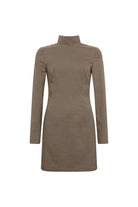 Designed with strong shoulder pads for a confident shape, this mini dress features a sleek high neckline and discreet centre-back zip for effortless wear. Long, slim-fitting sleeves offer a tailored finish, while the textured fabric adds depth and sophistication.