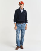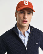 A walk through turning leaves or a quiet evening by the fire — this cable knit sweater offers both warmth and timeless charm. Crafted from soft cotton and shaped in a regular fit, it features an all-over cable structure that brings texture and depth to this countryside classic. The half-zip collar adds practical versatility, perfect for layering over a collared shirt or wearing open on milder days.