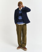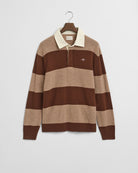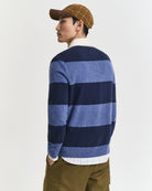 Patterned with timeless stripes, the design is elevated by a contrasting buttoned placket finished with corozo buttons for authentic character. Ribbed cuffs and hem complete the look, alongside a discreet embroidered shield at the chest — a quiet nod to enduring craftsmanship.