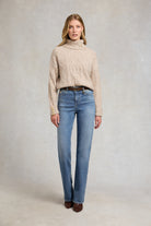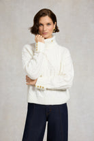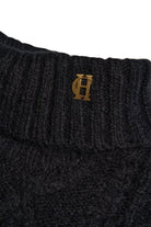 A quiet afternoon spent fireside or a brisk stroll through golden fields — this knit brings comfort with a sense of modern ease. Crafted from sumptuously soft yarns, it features a contemporary cable design that adds texture without weight. The boxy fit and dropped shoulders lend a relaxed, updated silhouette that layers effortlessly over countryside staples. Finished with signature gold rivets at the cuffs and discreet HC hardware at the collar, it blends refined detail with everyday wearability. A versatile piece that speaks to both heritage and understated style.