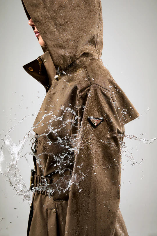 Clean front yoke detailing and a self-fabric waist belt with tortoiseshell fastening create a flattering, feminine shape. Signature gold hardware, Lycra storm cuffs, and a heritage-inspired monogram lining complete the look with function and finesse.