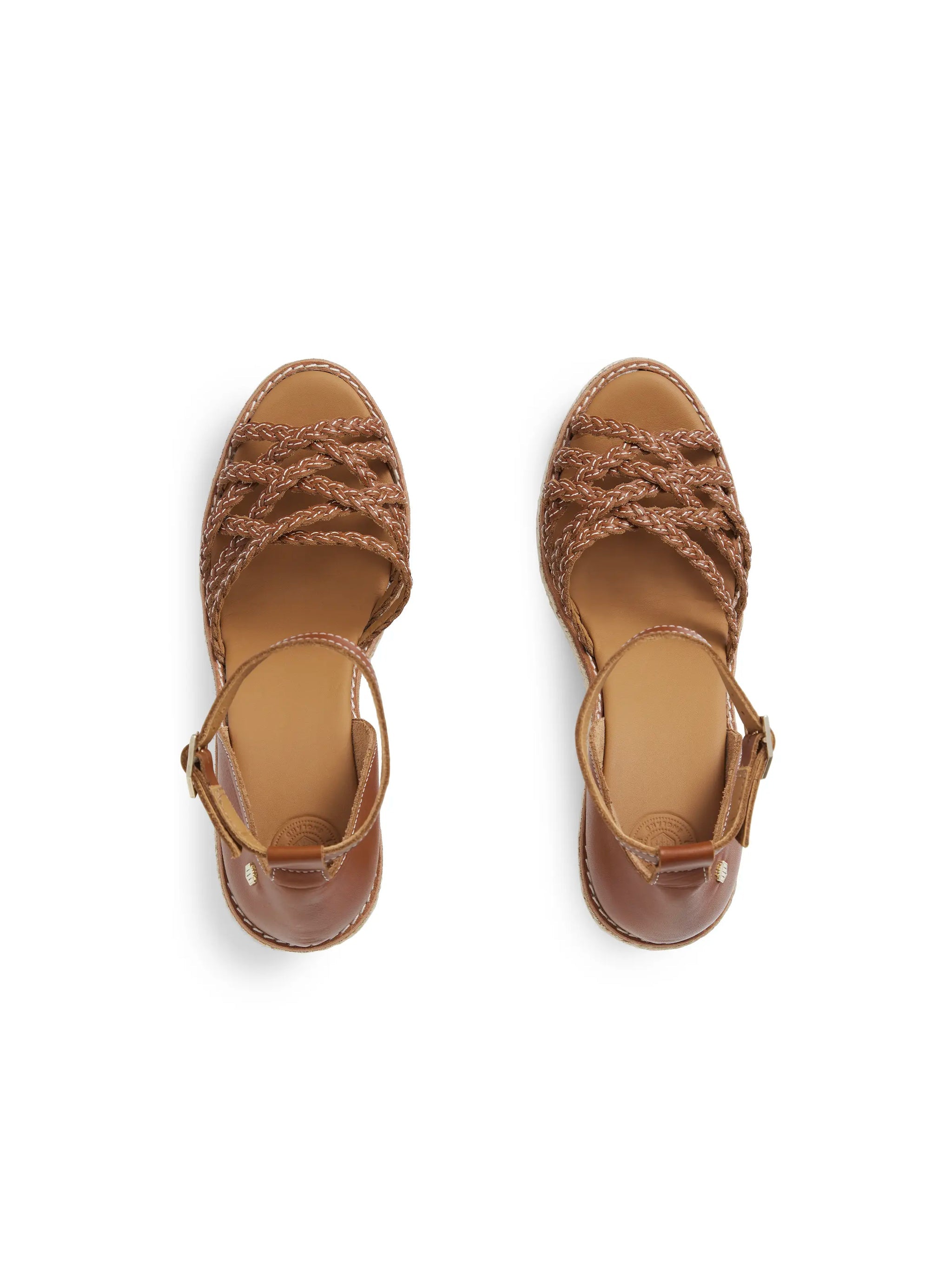 Handmade in Portugal from sustainably sourced leather, this timeless sandal pairs soft, braided straps with classic espadrille-inspired detailing on a 9.5cm wedge heel. Shiny light gold hardware and contrast ecru stitching bring subtle refinement, while the adjustable ankle strap, padded insole, and smooth leather lining ensure all-day comfort from afternoon strolls to evening suppers.