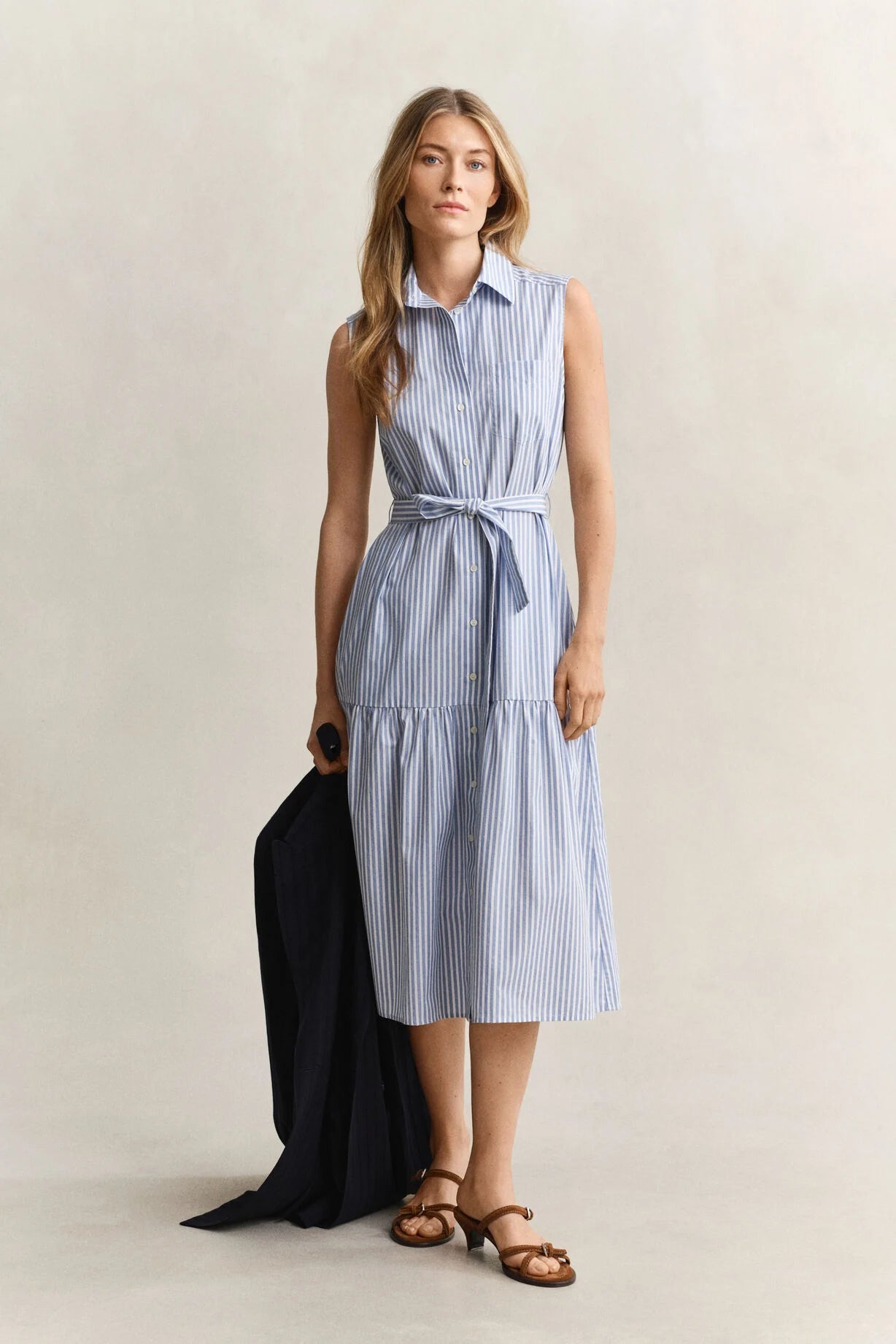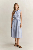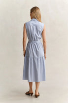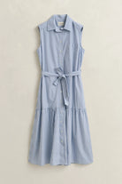 Crafted from 100 percent cotton in a fil a fil weave, the fabric uses contrasting warp and weft threads to create a soft texture and subtle stripe pattern. The sleeveless design is cut for a regular fit with a mid calf length and flattering A line shape. Cut and sewn panels through the skirt create a gentle pleated effect that allows ease of movement, while side seam pockets, a chest pocket and a buttoned placket add practical detail. A waist belt provides a neatly defined finish.