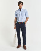 Smart enough for the town, comfortable enough for a day in the country — these slim-fit chinos are a true wardrobe staple. Crafted from organic cotton twill with a hint of stretch, they offer both structure and ease of movement. Designed with a mid-rise waist and a tailored fit through the hips and legs, they deliver a clean silhouette without feeling restrictive. Details include a coin pocket, buttoned back pockets, and classic double welt styling, all finished with a discreet GANT logo label at the back. Ideal for everyday wear with a touch of refinement.