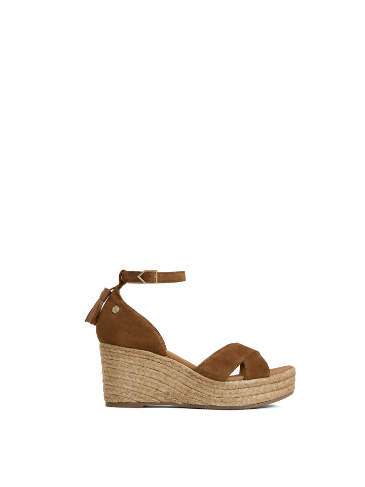Handcrafted in Spain from premium suede, this sandal features a 7.5cm jute wedge heel with crossover front straps and an adjustable ankle strap for a secure fit. Signature details, including shield hardware, chevron buckles, and a tonal tassel trim, add a distinctive finish. A padded insole and non slip sole ensure all day comfort, making it ideal for pairing with dresses or tailored summer pieces.